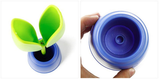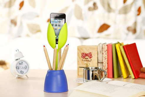 葉っぱ部分で携帯をキャッチし、鉢植え部分はペンなどの筆記用具を収納できます。