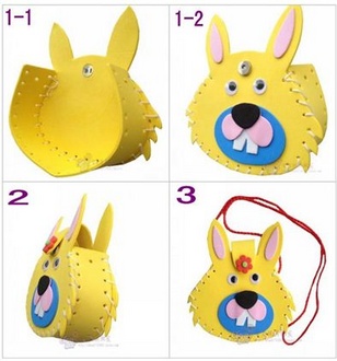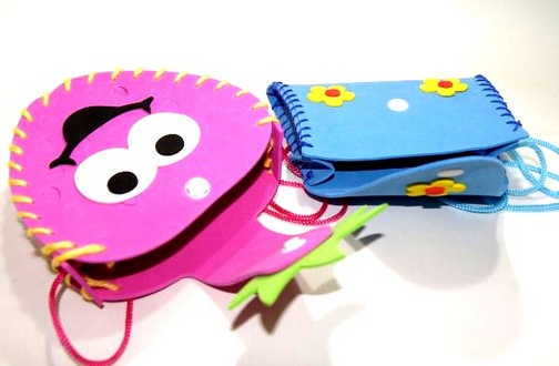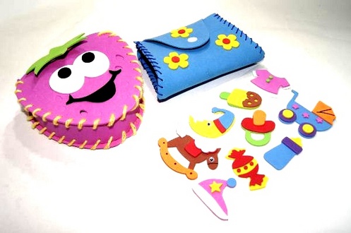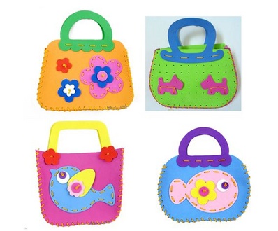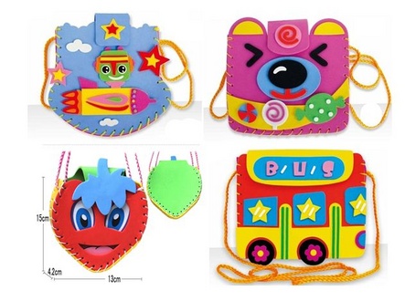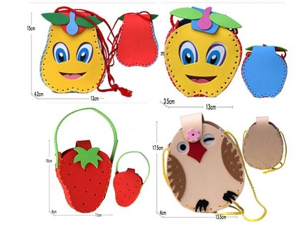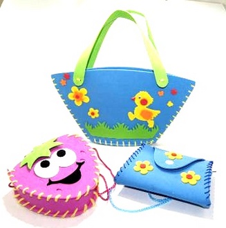 毛糸とプラスチックの針を使い簡単に縫い合わせてかわいいバッグを製作するキットになります。