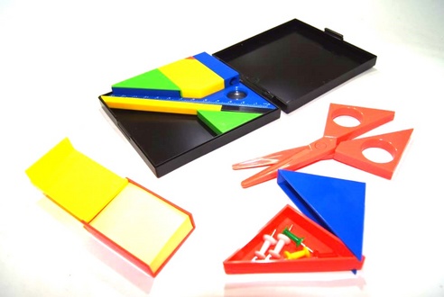 よく使う文房具が一式せっとになっており、コンパクトに収納されているだけでなくパズル状に収納するというユニークな発想のセットです。